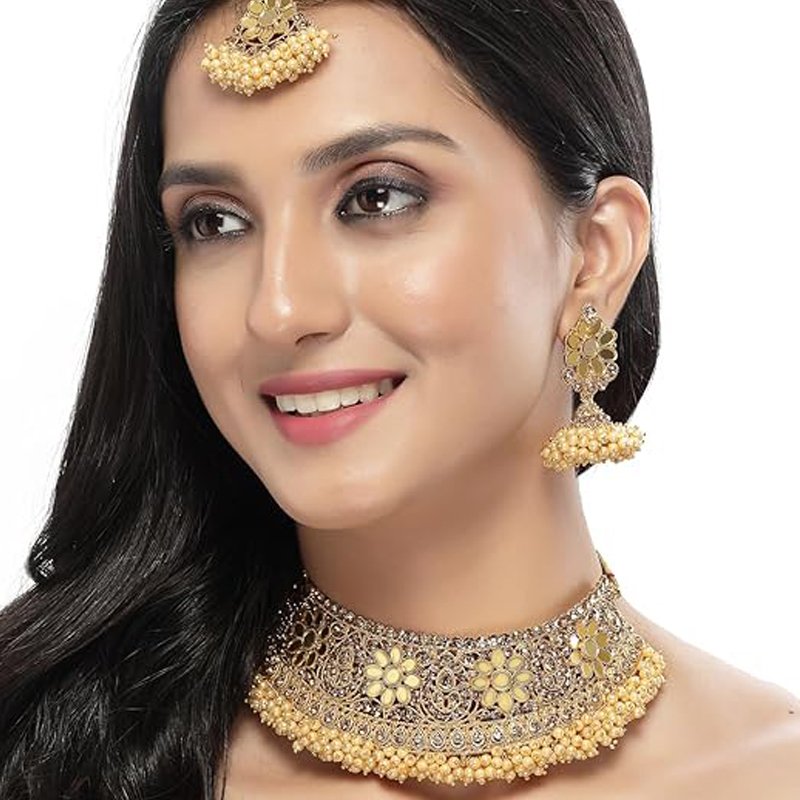 Gold Plated Gold Kundan & Beads Floral Choker Necklace Set With Earring And Maangtika