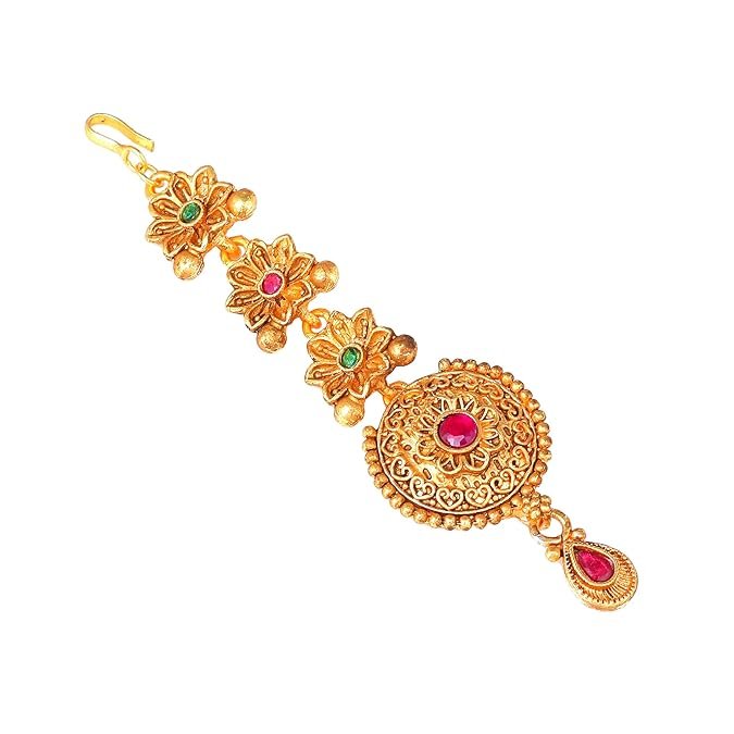 Enhance your ethnic ensemble with this Gold-Plated Traditional Maang Tikka, featuring a floral designer motif embellished with vibrant green and ruby crystals. Finished in an elegant matte texture, this timeless accessory is perfect for weddings, festivals, and special occasions.
