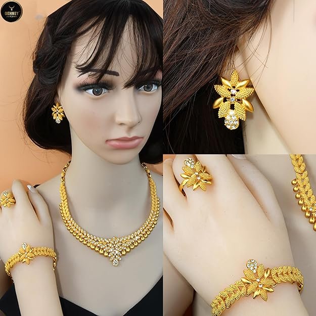 24k Gold Plated Choker Jewellery Set – Earrings, Ring & Bracelet Gold Necklace Set