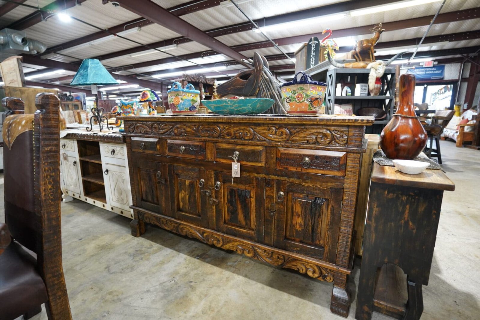 Experience the ultimate in rustic sophistication and handcrafted beauty with the stunning Checota Hand Carved Console. This exceptional piece boasts a sturdy, hand-hewn construction, intricate hand-carved details, and a distressed finish that evokes the warmth and character of traditional Southwestern craftsmanship.