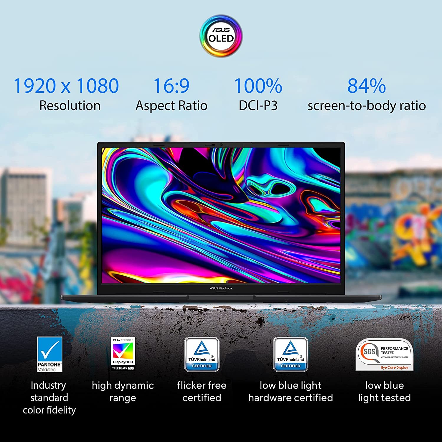 - Display: 15.6-inch (39.62 cms), FHD (1920 x 1080) OLED 16:9 aspect ratio, 0.2ms response time, 600nits peak brightness, Anti-glare display, 100% DCI-P3 color gamut, Screen-to-body ratio: 84ï¼…, VESA CERTIFIED Display HDR True Black 600, PANTONE Validated.